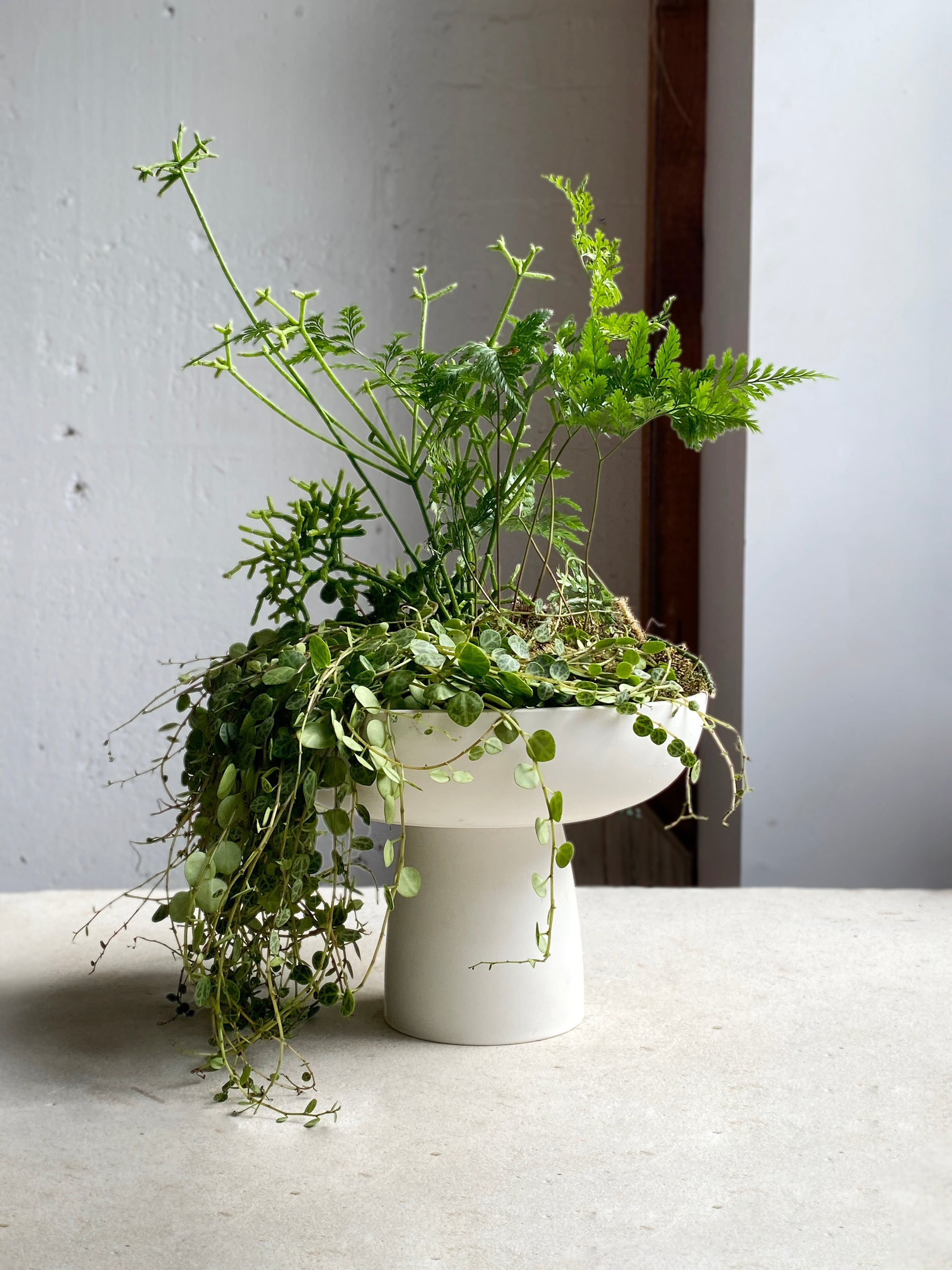 A white anthurium adorned with Peperomia rocca verde, all planted into our Charlotte pedestal bowl. This would look amazing on a coffee table or side table, & is perfect for a neutral themed home.